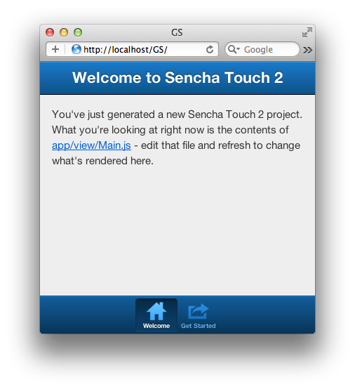 2.[INFO] Created file /Users/nickpoulden/Projects/sencha/GS/.senchasdk3.[INFO] Created file /Users/nickpoulden/Projects/sencha/GS/index.html4.[INFO] Created file /Users/nickpoulden/Projects/sencha/GS/app.js5....這將會產(chǎn)生一個叫做GS的Sencha Touch應用骨架,放在../GS目錄下。骨架應用中包含了所有你創(chuàng)建一個Touch應用所需要的東西,包括默認的index.html,一份Touch SDK的拷貝,CSS,圖片和打包你的應用所需的配置文件。