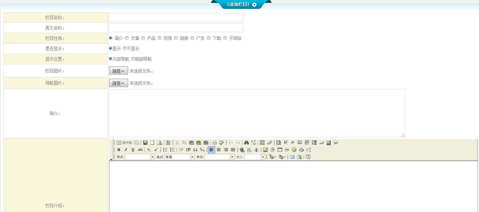 1、將您要添加的欄目名稱、英文名稱、欄目圖片、導航圖片、簡介、欄目介紹等填寫完成。