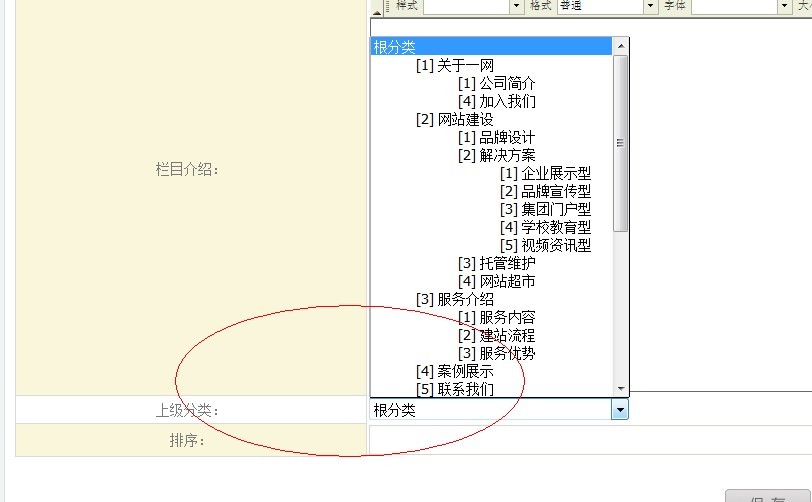 5、上級分類(重點):如下圖,選擇此欄目的父級欄目。默認是跟分類。